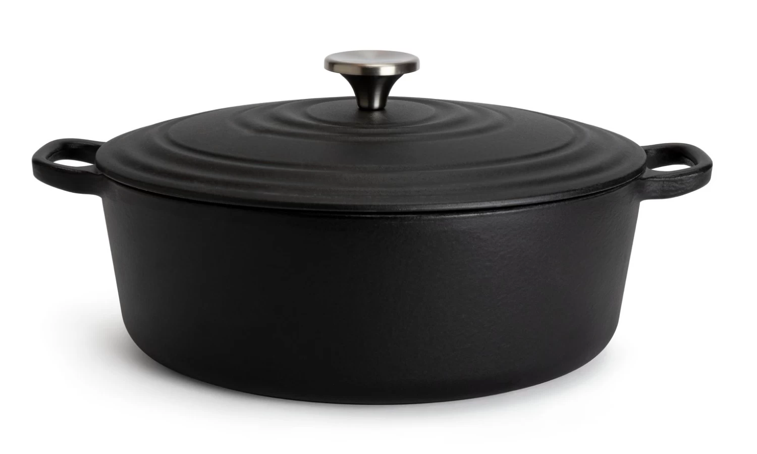 Cook and serve in style. Feast your eyes on our bold black cast iron casserole dish. With its ripple effect and silver knob, it's handsome enough to take straight from the oven to the table. And being cast iron it cooks evenly and retains heat for longer. So goodbye burnt bits and hello hot meals. It has an enamel coating which makes it easier to clean, too. What a dish.