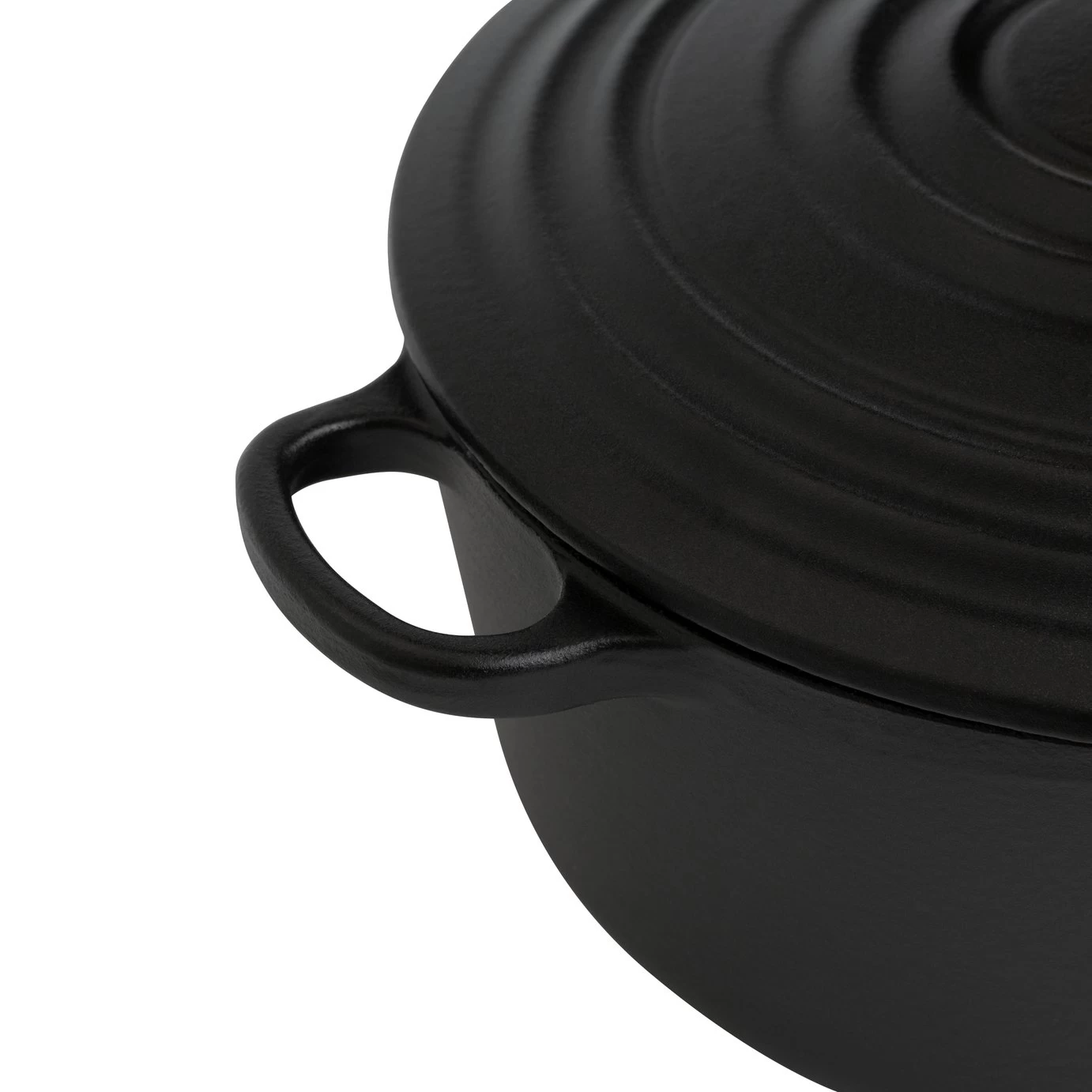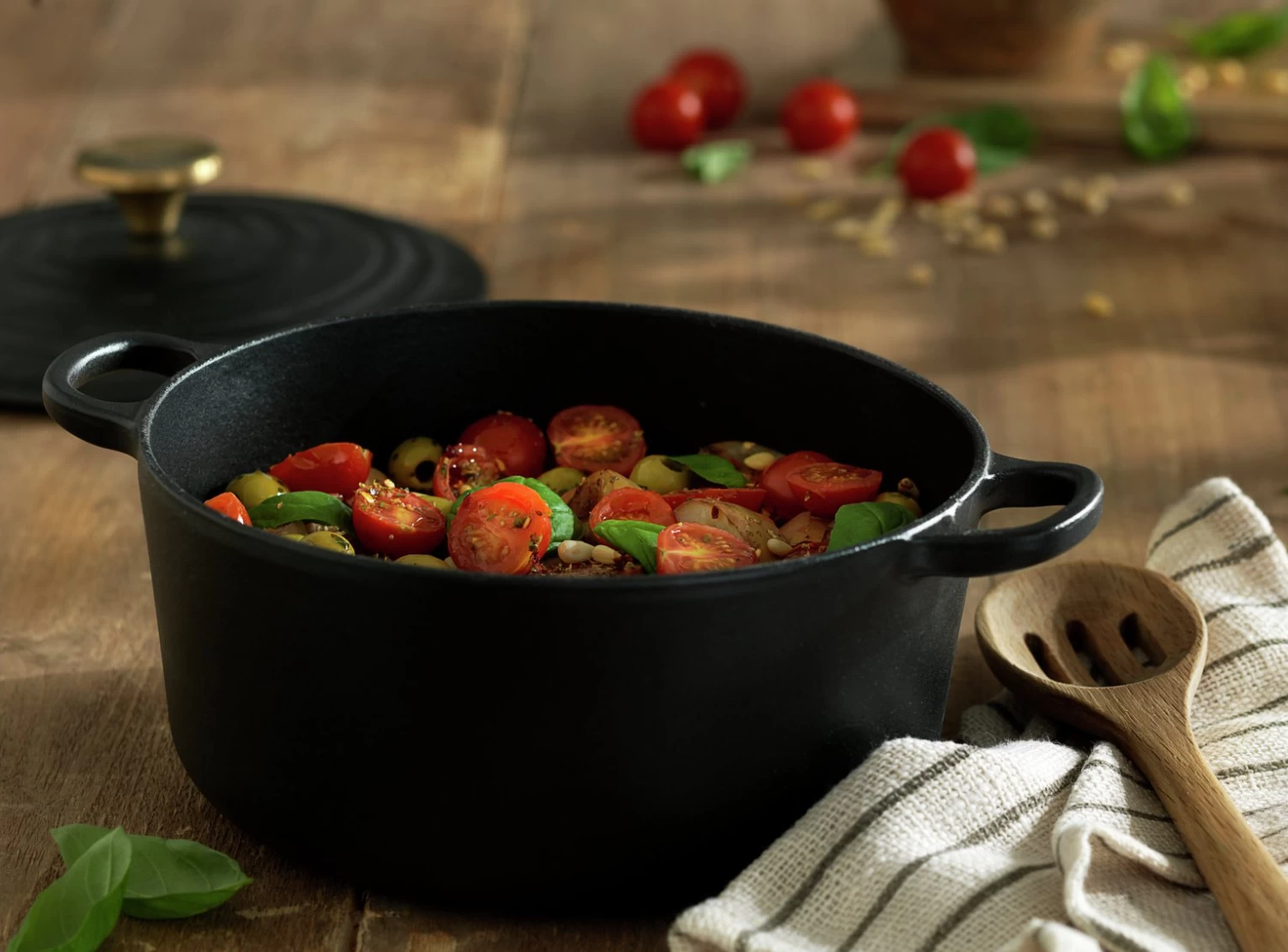 Mmmm there's no mistaking the mouth-watering aroma of a homemade casserole. And there's no mistaking the quality of our 3.3 litre cast iron casserole dish. You'll cook like a pro. It spreads heat evenly. So no more hot spots and burnt bits. The enamel glaze prevents rusting and makes it easy to clean. It's equally happy on any type of hob as well the oven. And off the heat it keeps food hotter for longer. So you don't have to rush to serve up. Then when you're ready just take it straight to the table. How deliciously satisfying is that.