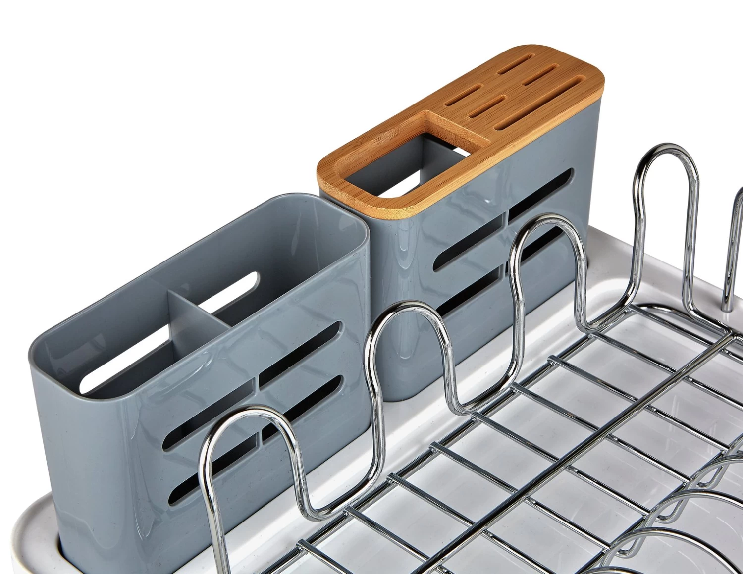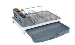 We all know that feeling. The moment you realise it's your turn to do the washing up. This attractive dish rack will soften that blow. With a large capacity for plates and bowls, it's also got dedicated sections for cutlery and sharp knives. Sleek and modern, its use of greys, chrome and wooden textures will look great in any kitchen.