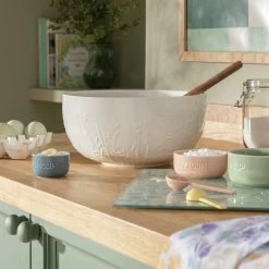 Mix it up with our big fine china bowl. In bright white with an embossed botanical design, it has a subtle look of country kitchen cool. A great choice for cake makers and bread bakers. And it makes a pretty special bowl for bringing salad or veg to the table.