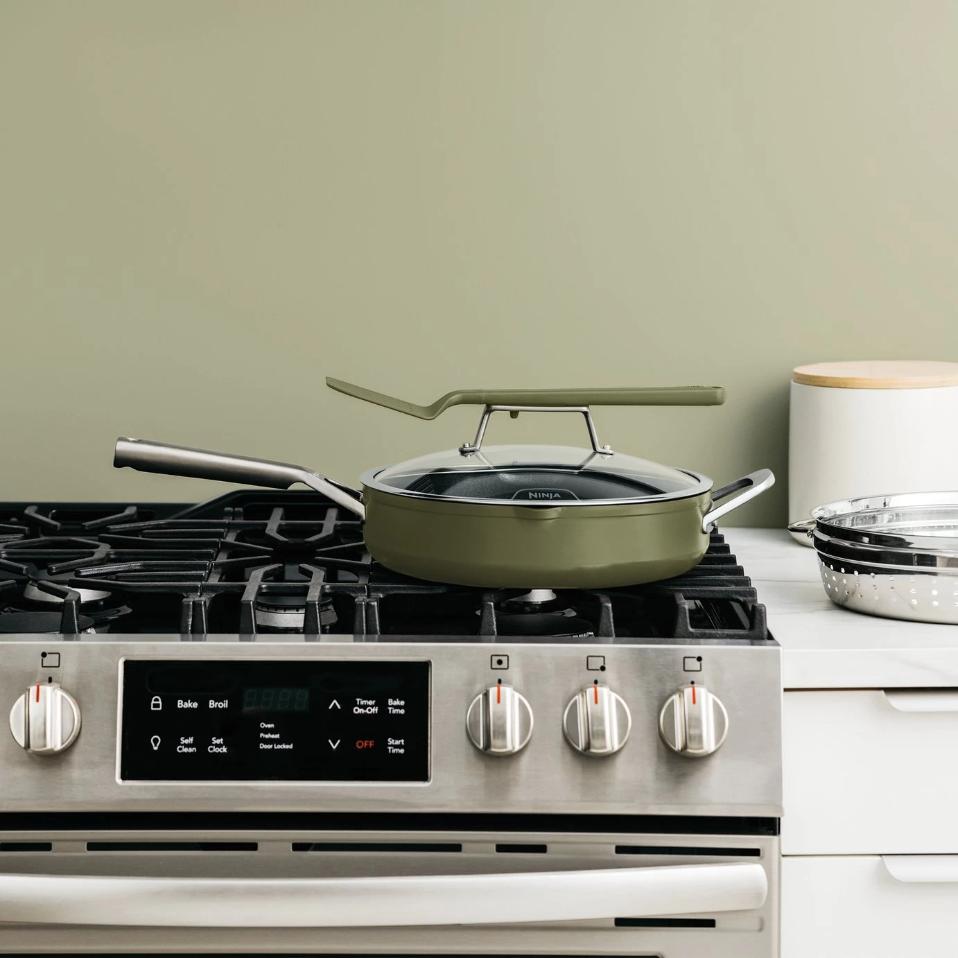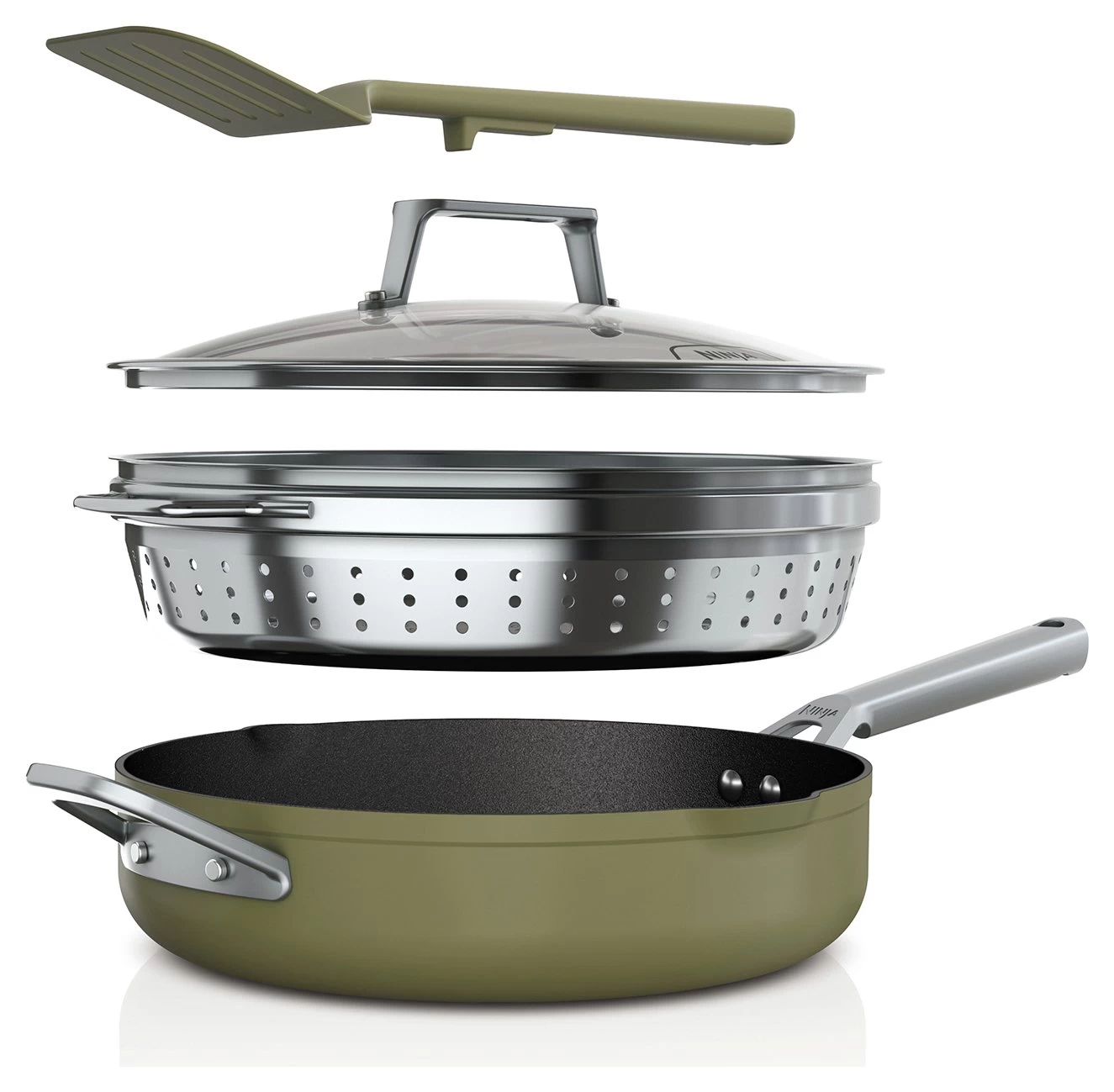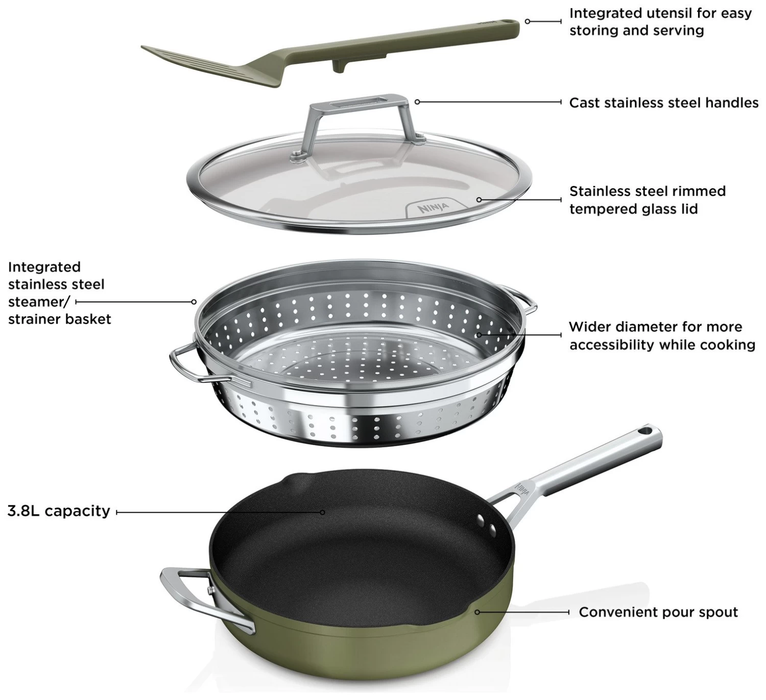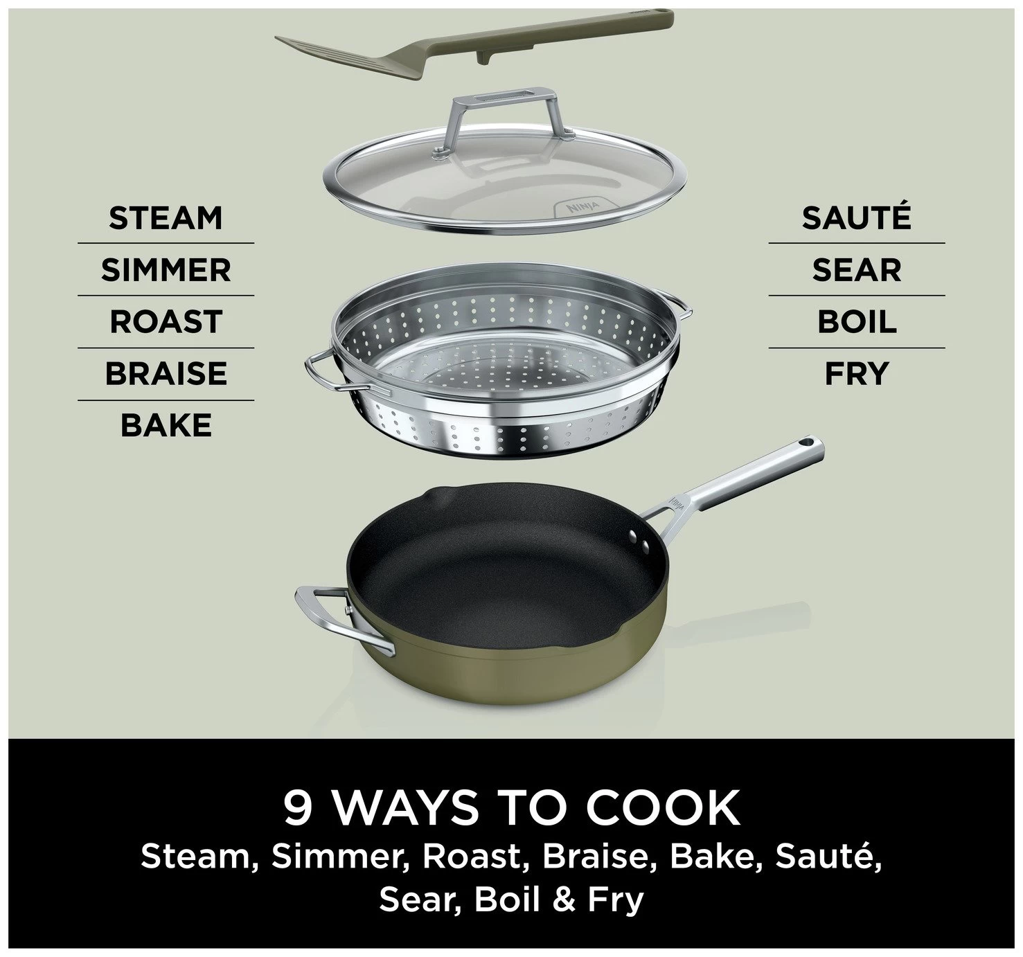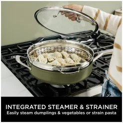 Everything you need to make it possible. Discover 9 ways to cook in one pan – Steam, Simmer, Roast, Braise, Bake, Saute, Sear, Boil and Fry your way to complete meals, quick lunches, desserts and more. Replacing 8 pieces of cookware, use it as a frying pan, saute pan, skillet, saucepan, steamer, roasting pan, baking dish and strainer. The space-saving design features an integrated steamer/strainer and a handy spatula stored in the heat-tempered glass lid. Go from hob to oven to table: it's oven safe up to 260C and suitable for all hob types.