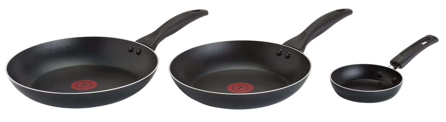 Tefal Everyday frying pans feature Titanium non-stick coating that ensures great durability, effortless clean-up and delivers performance you can count on every time you use your pans. Tefal Everyday frying pans also feature the newly designed Thermo-Signal which is our clearest ever way to indicate that the pan is at the right temperature to start cooking, the spot will turn solid red when it's ready to go. Suitable for all hobs excluding induction. What's in the box? 26cm frying pan, 20cm frying pan, 12cm frying pan.